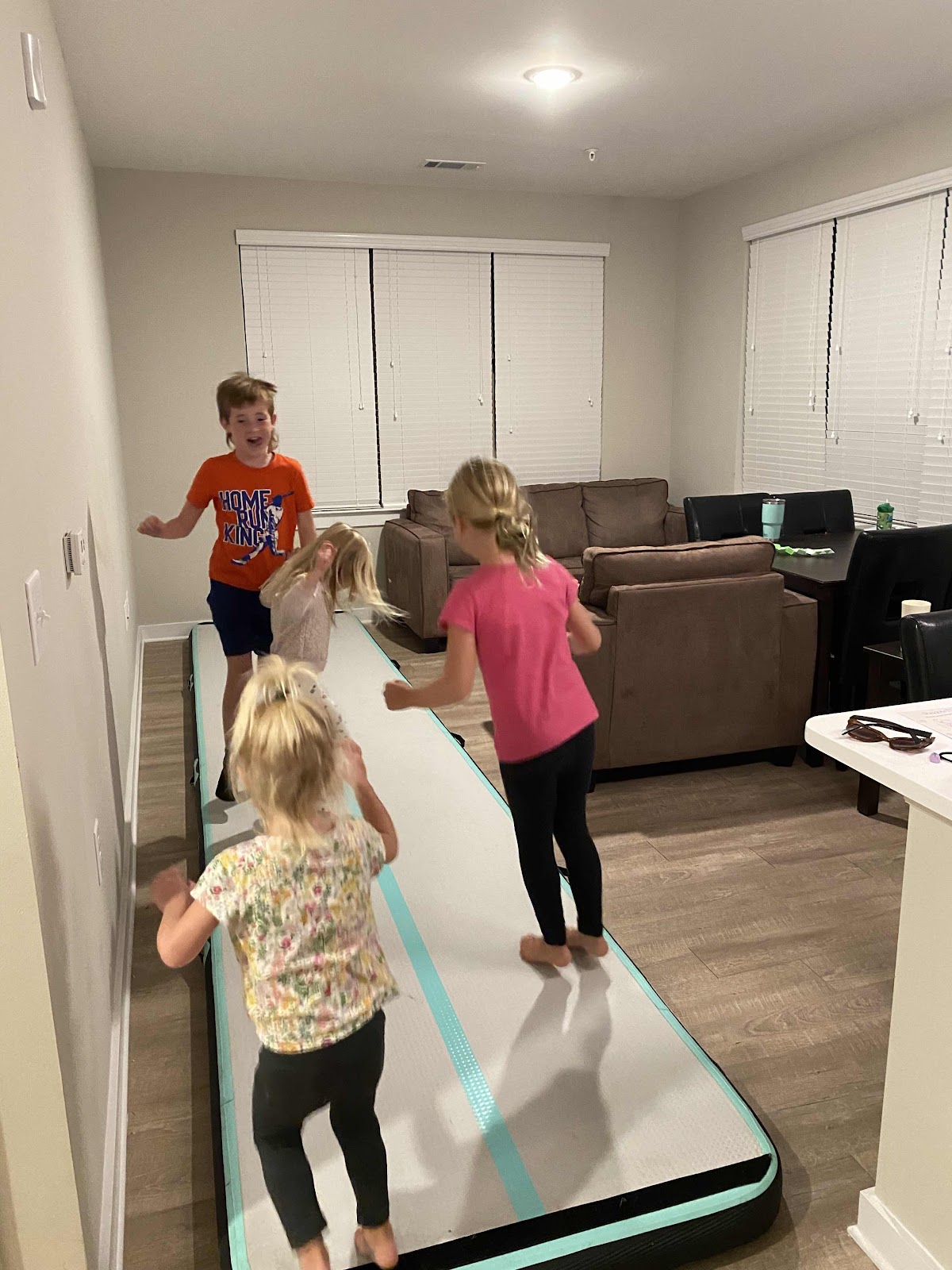 Jumping for joy on our tumble track because Daddy is back!