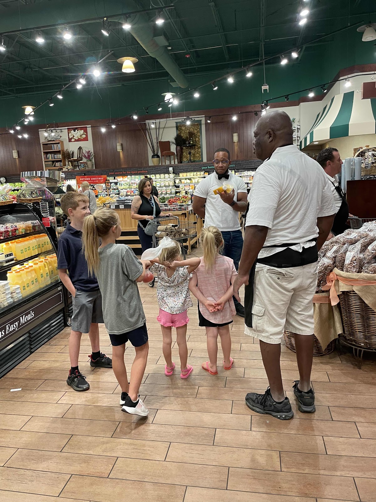 They've made multiple new friends over the past few months at our Tuesday dates to Fresh Market. Now every time we show up to purchase our chicken and beef, they have at minimum, four conversations--if not more--with all their friendly workers. And it's just the sweetest thing ever.